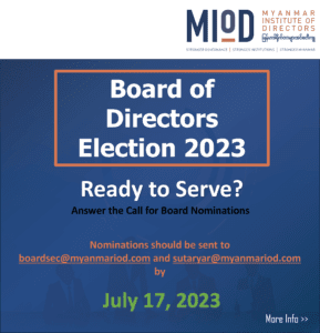 Pursuant to the Myanmar Institute of Directors (“MIoD” or the “Institute”) constitution and policy documents, the Institute will have an Annual General Meeting (“???”) at which time the members of the Institute must elect directors to the vacant positions on the Board.