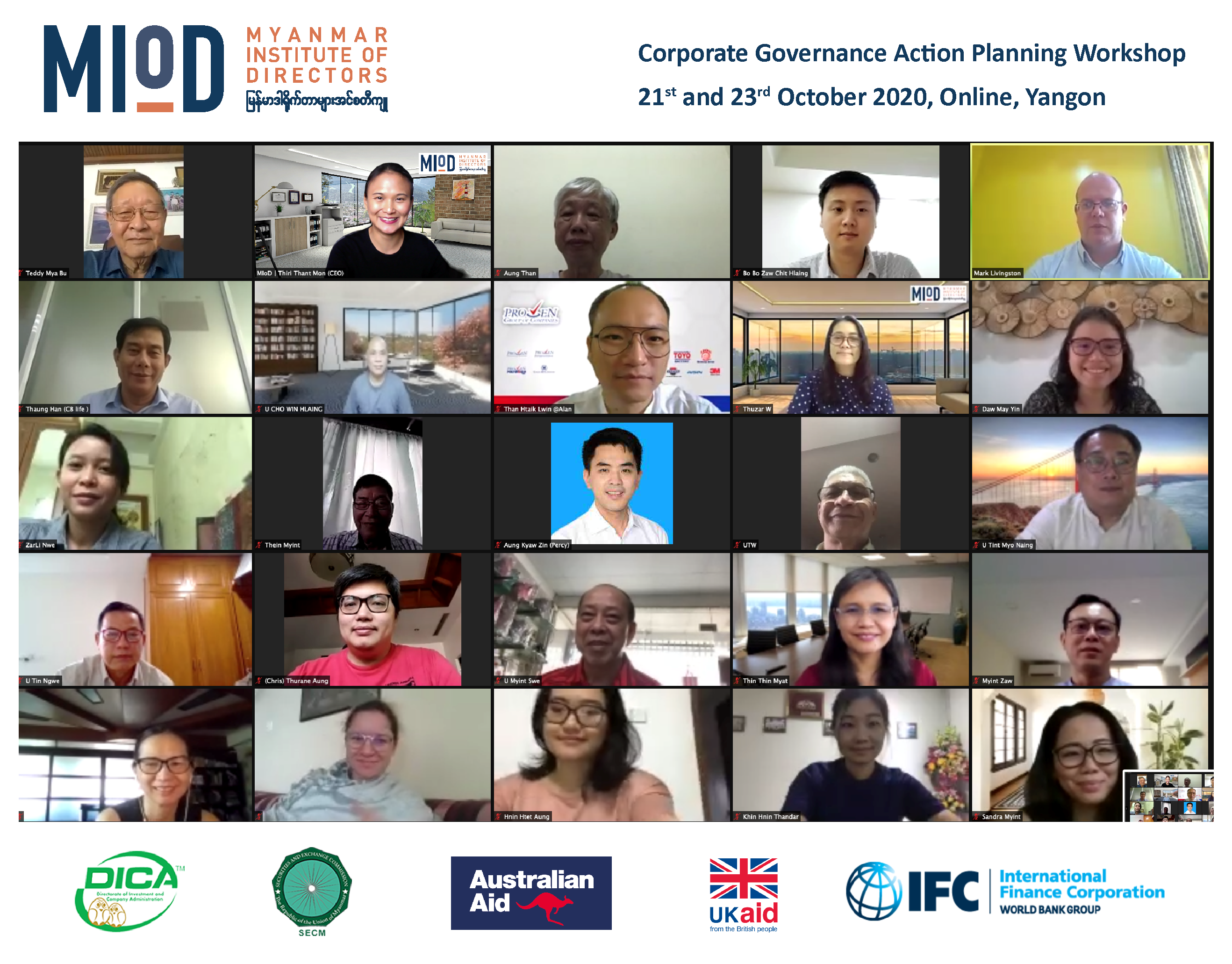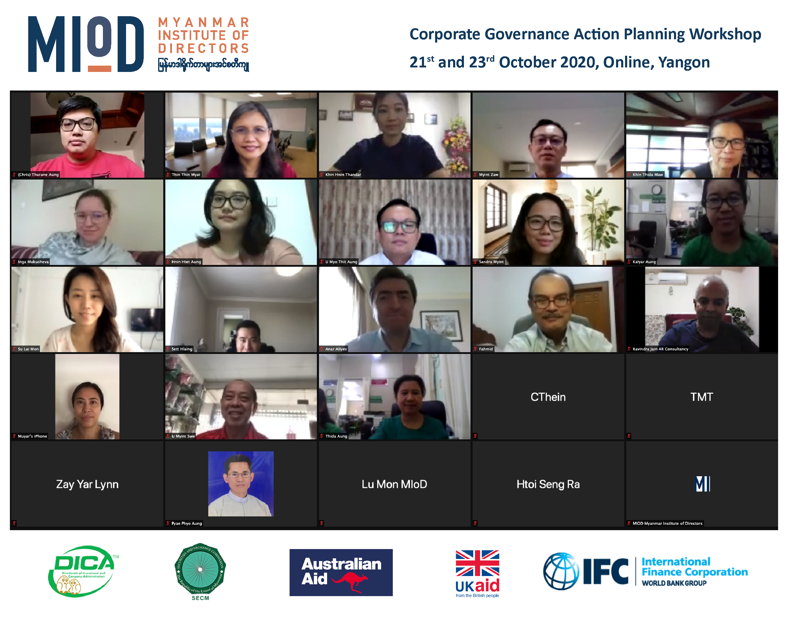 MIoD conducted first Virtual Training Program “Corporate Governance Action Planning Workshop” on 21st and 23rd October 2020. 32 board directors, senior executives, and corporate governance practitioners from 23 companies and government agencies attended MIoD’s 2-Day Online Course. The workshop is part of MIoD Learning Series and it provides a deep dive into the fundamentals of the corporate governance framework and helps directors and executives develop a plan for implementing effective governance practices in their companies. An expert team from MIoD, IFC, Livingstons Legal and World Bank delivered the workshop with both local and foreign expert facilitators.