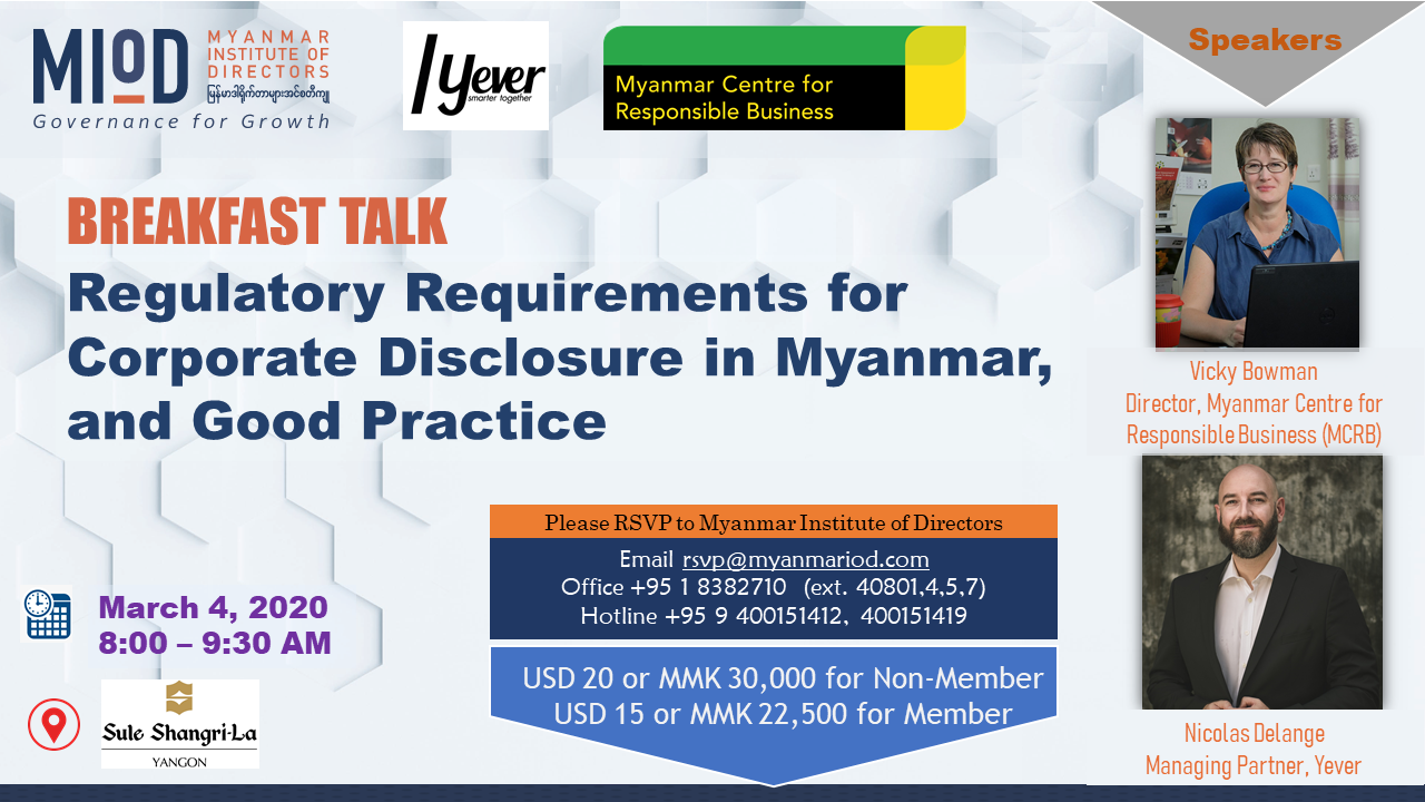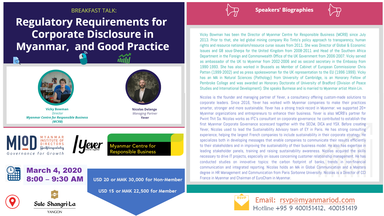Please join us at our Myanmar Institute of Directors (MIoD) Breakfast Talk Session on “Regulatory Requirements for Corporate Disclosure in Myanmar, and Good Practice”.